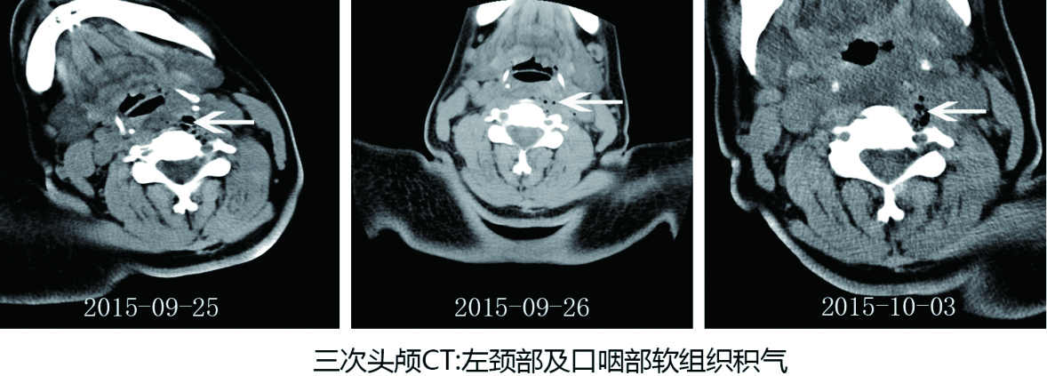 患者,女,56岁。因“呕血、黑便2 d”于2015-10-04拟“上消化道出血”入院。患者于9月25日被竹竿刺伤舌部,舌体部分断裂,喉镜咽部检查未见明显异常,CT示:左颈部及口咽部软组织损伤、积气,拟诊“舌外伤”,予舌部清创缝合术后,转本院就诊,复查CT示:咽喉壁后缘及左侧胸廓入口处软组织间隙散在积气,在急诊病房留观,拟诊“舌外伤”予抗炎、止血等治疗,4 d后,病情好转出院。既往有高血压病史。患者于2 d前无明显诱因突发呕鲜红血,大约150 mL,次日又少量呕血两次,解柏油样大便一次,再来本院就诊,查血常规:红细胞2.18× 1012/L-1,血红蛋白61 g/L,腹部CT未见异常。鉴于患者曾有舌部外伤病史,故请耳鼻喉科、口腔科及消化科共同会诊,入院诊断:上消化道出血,收住本院消化内科诊治。入院查体:体温36.6℃,脉搏86次/min,呼吸16次/min,血压98/67 mmHg(1 mmHg=0.133 kPa)。神清,贫血貌,舌部清创缝合术后,腹平软,轻压痛,其余无特殊阳性体征。入院后予以输血、抑酸、护胃、止血、扩容等对症支持治疗。患者于10月05日凌晨突发呕出大量鲜红色血液,随后心搏呼吸停止,予心肺复苏,0.5 h后抢救无效,宣布患者死亡。患者头颅CT及尸检结果见图 1, 2。