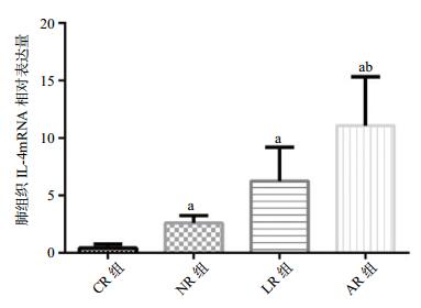 | 与CR组比较,aP < 0.01;与NR组比较,bP < 0.01;与LR组比较,bP < 0.05 图 1 各组大鼠肺组织IL-4 mRNA相对表达量 Figure 1 Relative expression of IL-4 mRNA in lung tissue of rats in each group |