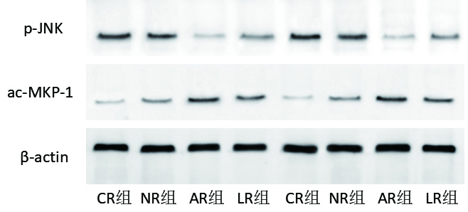各组肺组织JNK磷酸化的蛋白相对表达量分别为:CR组:(0.52±0.12);NR组:(0.42±0.08);LR组:(0.30±0.08);AR组:(0.17±0.06);与CR组、LR组和NR组相比,AR组JNK磷酸化的蛋白相对表达量明显减少(P < 0.01)。各组肺组织MKP-1乙酰化的蛋白相对表达量分别为:CR组:(0.14±0.07);NR组:(0.30±0.07);LR组:(0.37±0.02);AR组:(0.48±0.06);与CR组、NR组和LR组相比,AR组MKP-1乙酰化的表达明显增加(P < 0.01),见图 4-6。