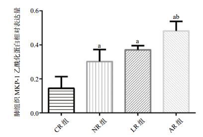 | 与CR组比较,aP < 0.01;与NR组、LR组比较,bP < 0.01 图 6 各组大鼠肺组织MKP-1乙酰化蛋白相对表达量 Figure 6 Relative expression of MKP-1 acetylation protein in lung tissue of rats in each group |