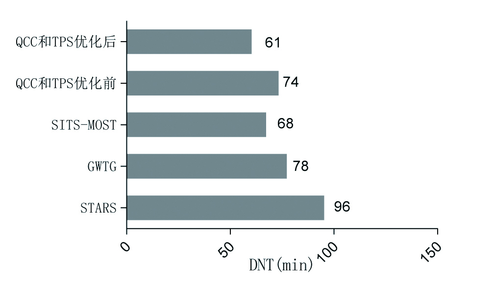 ODT与DNT之间存在负相关关系,越早到达医院的患者,往往越迟开始溶栓。有一项基于30 000例以上接受rt-PA溶栓治疗的研究也有相似发现[8]。这可能与“拖延心理”有关[12],临床医生潜意识里认为早到医院的患者距离指南规定的溶栓时间窗时间还很充裕,放慢了工作节奏[13]。本研究中这种负相关效应被QCC和TPS流程优化所减弱。与之研究结果不同的是,笔者发现DNT时间的缩短以发病120 min内最为显著,进一步说明采用QCC和TPS可以消除这种临床医生的拖延心理。
