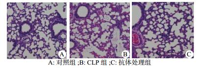| A:对照组; B: CLP组; C:抗体处理组 图 1 各组肺组织HE染色(200×) Figure 1 Lung tissue HE staining results of each group(200×) |