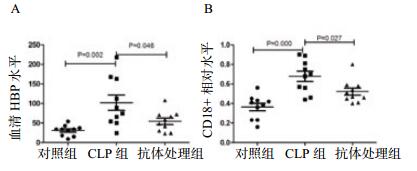 2.3 各组小鼠血清HBP和中性粒细胞CD18表达水平比较ELISA法检测小鼠血清HBP水平,结果提示HBP在CLP组明显升高(t=3.515, P=0.002),经抑制整合素功能抗体处理后明显下降(t=2.218, P=0.046),见图 3A。