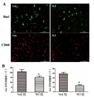 TBI后3 d,免疫荧光染色检测小鼠TBI后脑组织中小胶质细胞的数量,结果显示,与Veh组相比较(20.833±2.212)个,移植WJ(15.167±1.249)个明显减少TBI后的小胶质细胞的数量,差异有统计学意义(n=6,t=2.230,P=0.049)。CD68标记活化的小胶质细胞,结果表明,与Veh组相比较(38.833±3.301)个,移植WJ(13.500±2.094)个明显减少TBI后的小胶质细胞的数量,差异有统计学意义(n=6,t=6.481,P < 0.01),见图 5。