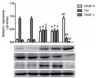 1.2.6 Western blot检测MMP-9、TIMP-1及TM蛋白的表达将HUVECs接种于6孔板内,细胞贴壁生长至60 %时给予不同处理因素,48 h后弃培养液,用1×PBS洗涤3次,加适量0.25 %胰蛋白酶消化细胞,将细胞悬液800 r/min离心3 min后弃上清液,加入适量含抑制剂的蛋白裂解液,吹打混匀后冰置15 min,再经4 ℃ 12 000 r/min离心10 min,取上清液,采用BCA试剂盒测定蛋白浓度。按每孔50 μg蛋白量上样,经SDS-PAGE胶电泳转移至PVDF膜上,5 %脱脂奶粉室温封闭1 h,加适当比例一抗(MMP-9 1: 1 000,TIMP-1 1: 500,TM 1: 1 000,β-Actin 1: 3 000) 4 ℃过夜,TBST洗3次,每次10 min,加适当比例二抗(1: 3 000)室温孵育1 h,然后TBST洗3次,每次10 min。用吸水纸吸净PVDF膜上的液体,滴加等比例混合的A、B显影液,在凝胶成像系统下取图并分析实验结果。
