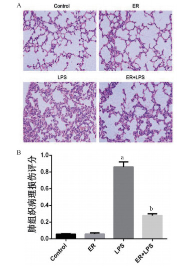 | A肺组织HE染色(×400)Control:空白对照组;ER:厄洛替尼灌胃对照组;LPS:LPS诱导ALI组;ER+LPS:厄洛替尼灌胃后LPS处理组;B肺组织病理损伤评分;与Control组相比较, aP < 0.05;与LPS组相比较, bP < 0.05 图 1 肺组织病理改变及肺损伤评分 Figure 1 Pathological changes of lung tissue and lung injury score |