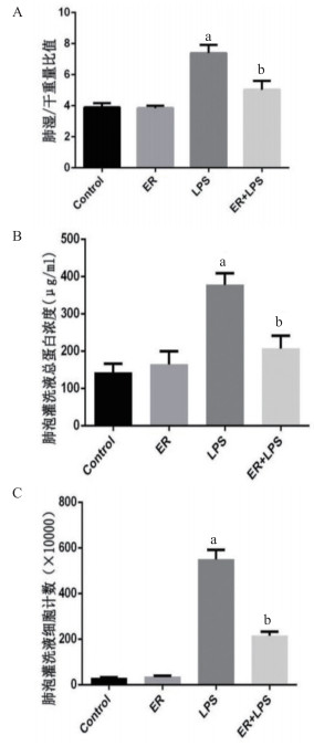 肺湿/干质量比值结果(图 2A)显示:各组间评分差异具有统计学意义(F=46.86,P < 0.01),LPS组肺湿/干质量比值明显增加,而ER+LPS组湿/干质量比值较LPS组明显减轻;肺泡灌洗液总蛋白浓度(图 2B)显示:各组间评分差异具有统计学意义(F=218.4,P < 0.01),LPS诱导的ALI可见大量的蛋白渗出,ER处理能够减轻LPS诱导的蛋白渗出;肺泡灌洗液细胞计数(图 2C)亦表明各组间评分差异具有统计学意义(F=407.9,P < 0.01),ER能够减轻LPS诱导的细胞渗出,差异具有统计学意义(P < 0.05)。