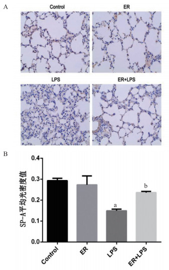 SP-A免疫组织化学染色如图 3A所示,Control组SP-A阳性的细胞均匀分布于肺泡上皮细胞层;ER组亦可见SP-A阳性的细胞分布于上皮细胞层;LPS组SP-A阳性的细胞数目明显减少;ER+LPS组可见增多的SP-A阳性的细胞。SP-A平均光密度值(图 3B)显示:各组间评分差异具有统计学意义(F=39.37,P=0.024 4),与Control组相比,LPS组平均光密度值明显偏低,ER+LPS组平均光密度值较LPS组升高,差异具有统计学意义(P < 0.05)。