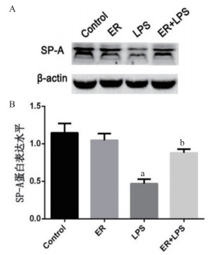 采用Western Blot检测SP-A表达(图 4A),使用AlphaEase FC软件分析结果(图 4B),各组间评分差异有统计学意义(F=27.88,P=0.015 4),与Control组相比较,LPS组SP-A蛋白表达水平明显偏低;而ER+LPS组蛋白表达水平较LPS组升高,差异具有统计学意义(P < 0.05)。