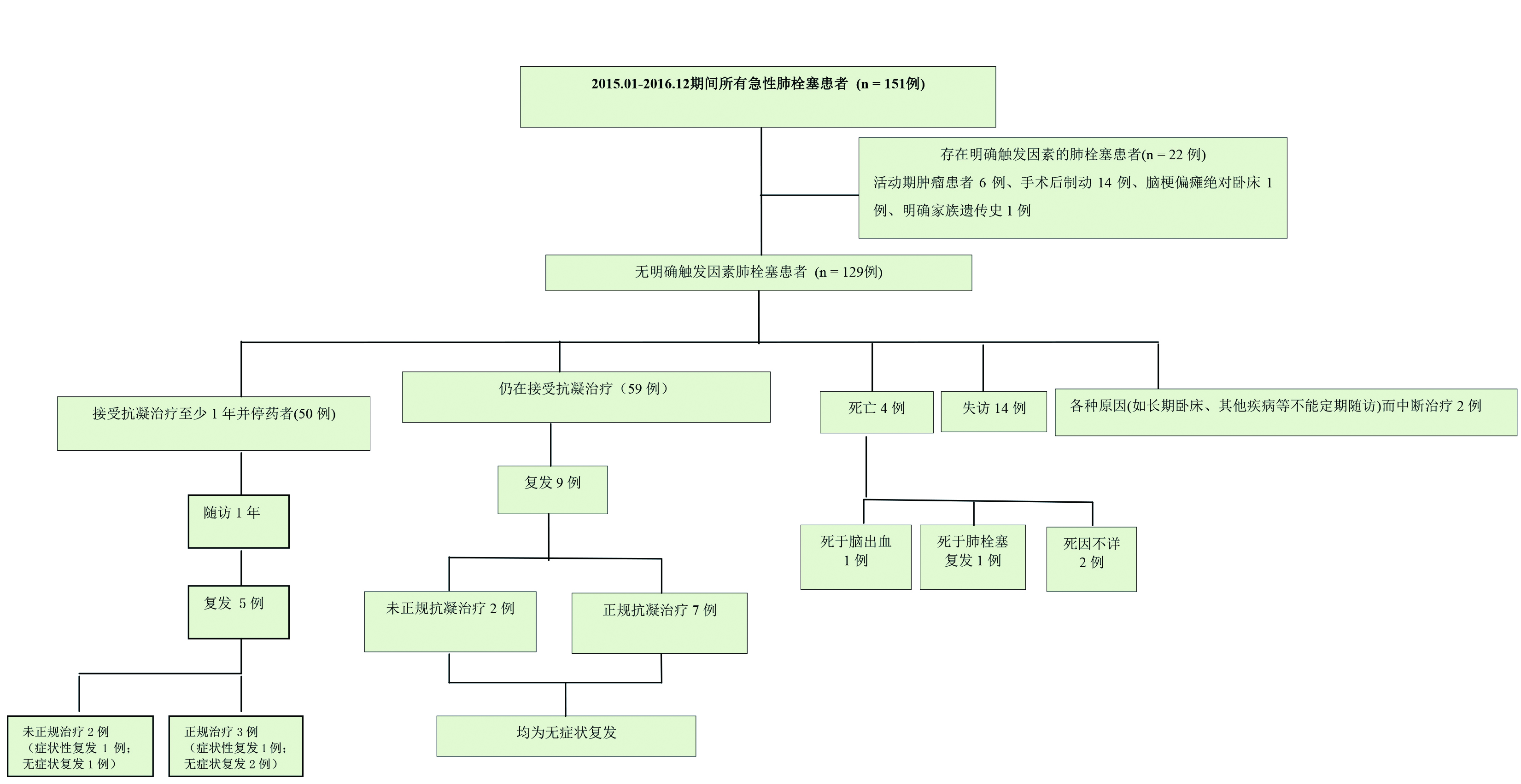 1.4 患者相关信息包括年龄;性别;体质量指数(body mass index, BMI);明确诊断PE的时间;家族史;既往病史,如冠状动脉硬化性心脏病、高血压、血脂代谢紊乱、糖尿病、吸烟、高同型半胱氨酸血症(hyperhomocysteinemia, HHCY)、阻塞性睡眠呼吸暂停综合征(obstructive sleep apnea syndrome, OSAS)等;本次发病是否存在明确触发因素;抗凝治疗开始的时间;抗凝期间是否规律随诊;治疗达标情况;随访过程中是否发现肿瘤(如果存在,记录肿瘤部位、治疗方法及其转归);目前抗凝药物的使用状态,是否按医嘱停用抗凝药(记录具体时间)、持续使用抗凝药物者需具体记录继续使用抗凝药物的原因如合并心房纤颤、治疗中确诊复发、心脏瓣膜置换术或者是没有任何原因继续使用;对于明确存在复发者,记录患者明确复发的手段及部位、复发时间(记录治疗结束后还是抗凝治疗中)、属于症状性复发还是无症状性复发;患者的转归,如已经死亡的患者记录具体死亡原因。