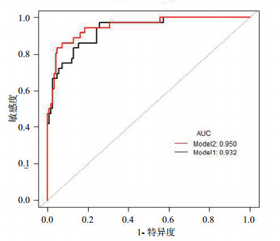 | 模型1为传统指标的ROC曲线(AUC=0.932),模型2为传统指标加上心肌损伤标记物的ROC曲线(AUC=0.950),传统指标的参数包括CRP与PCT值、CTSI评分、BISAP评分、APACHE Ⅱ评分和SOFA评分,心肌损伤标记物包括proBNP、CK-MB和cTnI。Model 1 vs. Model 2,P=0.09 图 1 模型1与模型2对SAP的预测效应 Figure 1 The predictive effect of model 1 and model 2 for SAP |