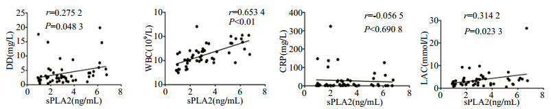 患者血清sPLA2与WBC、LAC、DD成正相关(r=0.653 4,P < 0.01;r=0.314 2,P=0.023 3;r=0.275 2,P=0.048 3),sPLA2与CRP无相关性(r=-0.056 5,P=0.690 8)。见图 1。