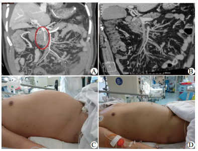 | A:术前CTA示SMV-PV主干及分支广泛血栓形成(圆圈内),肠壁分层、肠腔明显扩张、腹腔积液;B:术后1个月CTA示SMV-PV及分支血栓部分再通,SMV侧枝循环形成,肠腔无扩张及坏死;C:术前平卧位,可见全腹膨隆明显;D:术后第4天平卧位,可见腹围明显减小 图 1 患者术前术后CTA和体征 |