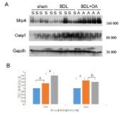 | A:蛋白免疫印迹,sham:假结扎组,BDL:胆道结扎组,BDL+OA:胆道结扎并灌胃齐墩果酸,S:生理盐水,A:齐墩果酸; B:蛋白相对表达量,aP < 0.05,bP > 0.05 图 2 Mrp4、Oatp1在蛋白水平的表达变化 Figure 2 The changes of Mrp4/Oatp1 in the protein level |