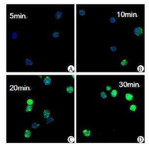 | RY-15与THP-1细胞系分别共培养5 min(A)、10 min(B)、20 min(C)、30 min(D)。10 min后,RY-15开始入胞; 30 min后,RY-15入胞效果显著 图 1 RY-15作用不同时间点后入胞效果比较 Figure 1 Compare the effects of entering cell after RY-15 stimulating for different time in THP-1 cell |