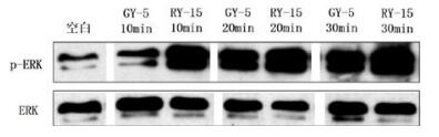 | 注:GY-5和RY-15分别作用于THP-1细胞10 min、20 min、30 min后,检测ERK和p-ERK表达水平 图 3 GY-5和RY-15对THP-1细胞ERK磷酸化的影响 Figure 3 Compare the effects of GY-5 and RY-15 on ERK phosphorylation in THP-1 cell |