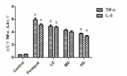 2 结果 2.1 五组大鼠血浆中TNF-α、IL-6水平百草枯中毒组大鼠血浆中TNF-α、IL-6水平较对照组大鼠明显上升,对于差异有统计学意义(P < 0.01),经过不同剂量的血必净给药,血浆中TNF-α、IL-6水平逐渐降低,但仍然高于对照组中的水平,差异有统计学意义(P < 0.01),且经过血必净治疗后,血浆中TNF-α、IL-6水平与百草枯中毒组相比明显下降,差异有统计学意义(P < 0.05),见图 1。