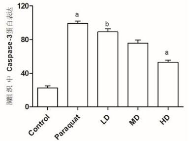 | 与对照组相比,t=8.106, aP < 0.01;与百草枯中毒组相比,t=8.234, bP < 0.05 图 2 五组大鼠肺组织中Caspase-3蛋白表达 Figure 2 Protein expression level of Caspase-3 in plama of rats in groups |