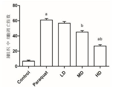 | 与对照组相比,t=8.547, aP < 0.01;与百草枯中毒组相比,t=9.325, bP < 0.05 图 3 五组大鼠肺组织细胞凋亡指数 Figure 3 Apoptosis index in lung tissue of rats in groups |