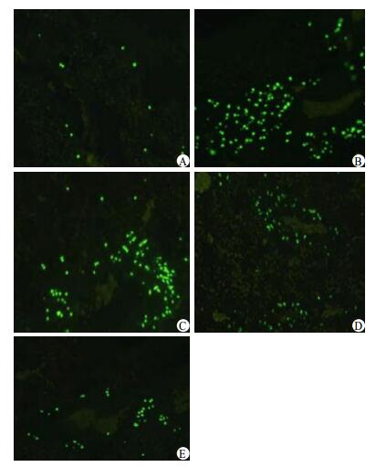 | A:Conrtol组; B: Paraquat组; C: LD组; D: MD组; E: HD组 图 4 五组大鼠肺组织细胞凋亡染色图 Figure 4 The staining of apoptosis cells in lung tissue of rats in groups |