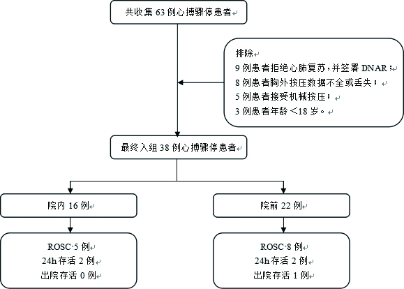 2 结果 2.1 患者一般资料2017年1月至2017年8月,共接收63例院前和院内心搏骤停患者。根据纳入排除标准,拒绝心肺复苏,并签署DNAR9例,胸外按压数据不全或丢失8例,接受机械按压5例;年龄 < 18岁3例,最终纳入38例心搏骤停患者,其中男性27例(71.05%)。院前心搏骤停22例(57.89%),年龄40~97岁,(63.37±14.45)岁。CA原因包括心源性停搏22例(57.89%),其中急性心肌梗死18例(47.37%),脑血管意外8例(21.05%),创伤5例(13.16%),其他疾病3例(7.89%)。心肺复苏后,13例患者ROSC,占34.21%,其中24 h存活4例,占10.53%,出院存活1例,占2.63%。患者具体入组筛选流程及预后情况见图 1。