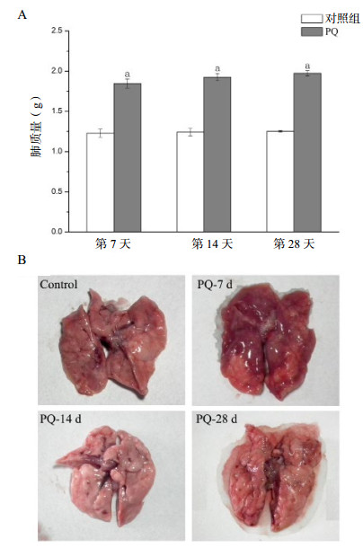 2 结果 2.1 PQ诱导的肺损伤和肺纤维化如图 1A所示,PQ给药7、14和28 d后,实验组大鼠肺质量与对照组相比,分别为(1.849±0.566)g vs.(1.230±0.050)g(P < 0.01)、(1.925±0.047)g vs.(1.242±0.046)g(P < 0.01)、(1.975±0.034)g vs.(1.252±0.011)g(P < 0.01),各组中大鼠肺质量均较对照组增加。肺的大体观察呈现纤维化改变(图 1B)。这些结果表明PQ能够在这种大鼠模型中诱导肺损伤和肺纤维化。