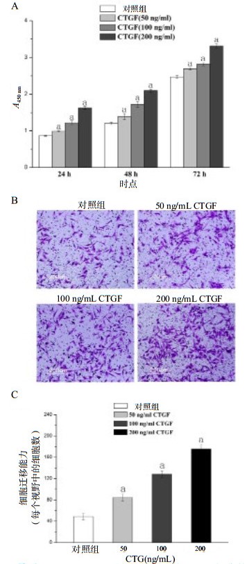 1.2.3 Transwell检测肺成纤维细胞的迁移能力将细胞以每上层室4×104个的密度接种在无血清培养基的6孔板中。含有不同浓度CTGF(50~200 ng/mL)的培养基(含10%FBS, 1 mL)同时加到下室中。上下腔室由孔径为8 μm的可渗透聚碳酸酯膜隔开。培养24 h。而后用4%多聚甲醛固定滤膜下表面的细胞30 min,PBS洗涤3次,并用0.1%结晶紫染色30 min。用棉签轻轻刮掉上表面的残留细胞。每个膜随机选取10个不同的视野,并使用显微镜记数。实验重复进行3次。
