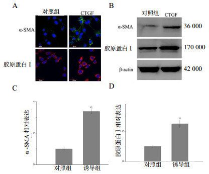 在MRC-5细胞中加入100 ng/mL的CTGF培养3 d。利用免疫荧光和Western-blot来检测α-SMA和胶原蛋白I的表达水平,以评估肌成纤维细胞分化的情况。如图 5A所示,免疫荧光染色显示,与对照组相比,CTGF诱导组的α-SMA(绿色荧光)和胶原蛋白I(红色荧光)表达增加。另外,在图 5B~D中,Western-blot亦证明CTGF诱导α-SMA和I型胶原蛋白表达水平明显增加,表明肺成纤维细胞分化成肌成纤维细胞。