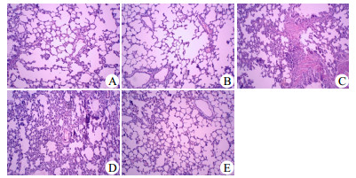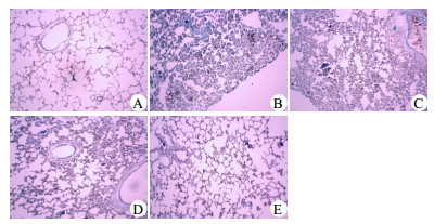 | A:正常对照组;B:模型对照组;C:地塞米松组;D:曲尼司特组;E:联合治疗组 图 1 各组肺组织HE染色(×100) |