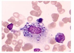| 图 1 油镜下患者骨髓象见大量荚膜组织胞浆菌(瑞氏染色,×100) |