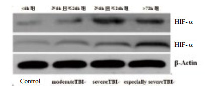 图 1 不同损伤程度及损伤后不同时间人群HIF-1α蛋白的表达水平 Figure 1 The expression of HIF-1α in TBI patients with different damage degree and different time points after the injury and control subjects |