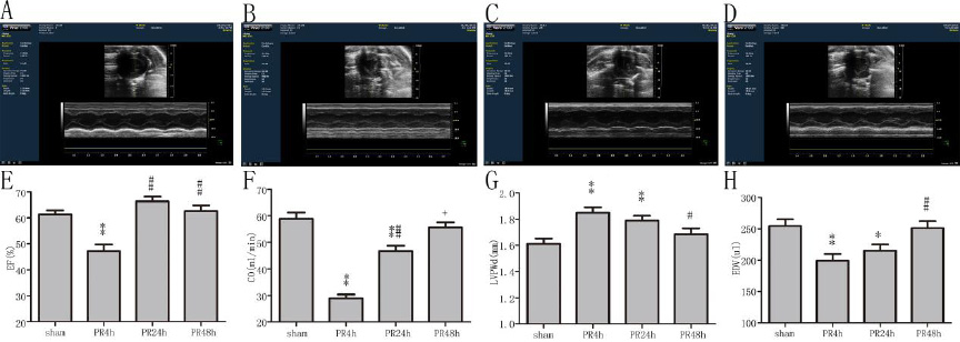 PR 4 h组大鼠EF值较sham组显著下降(P < 0.01,图 1),PR 24 h及PR 48 h组大鼠EF值与sham组比较差异无统计学意义(均P > 0.05);PR 4 h及PR 24 h组大鼠CO较sham组均显著下降(均P < 0.01),且PR 24 h组高于PR 4 h组(P < 0.01),但PR 48 h组与sham组比较差异无统计学意义(P > 0.05);PR 4 h及PR 24 h组大鼠LVPWd较sham组均显著增厚(均P < 0.01),PR 48 h组与sham组比较差异无统计学意义(P > 0.05);PR 4 h及PR 24 h组大鼠EDV较sham组均显著变小(均P < 0.05),PR 48 h组与sham组比较差异无统计学意义(P > 0.05)。