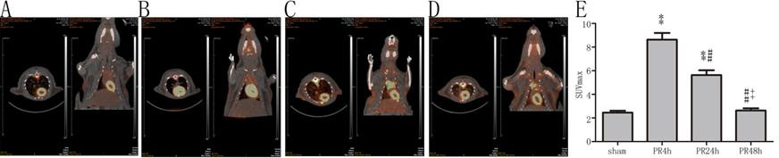 PR 4 h及PR 24 h组大鼠心肌SUVmax较sham组均显著升高(均P < 0.01,图 2),PR 24 h组低于PR 4 h组(P < 0.01),PR 48 h组与sham组比较差异无统计学意义(P > 0.05)。