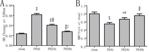 加入氯化钙诱发线粒体肿胀后,各组线粒体在540 nm处吸光度均有下降,PR 4 h及PR 24 h组吸光度下降值均高于sham组(均P < 0.01,图 3),PR 24 h组较PR 4 h组下降程度减轻(P < 0.01),PR 48 h组与sham组比较差异无统计学意义(P > 0.05);PR 4 h及PR 24 h组大鼠心肌MMP较sham组均显著下降(均P < 0.05),PR 24 h组高于PR 4 h组(P < 0.05),PR 48 h组与sham组比较差异无统计学意义(P > 0.05)。