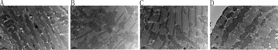 | A:sham组;B:PR 4 h组;C:PR 24 h组;D:PR 48 h组 图 4 电镜下心肌超微结构 Figure 4 Ultrastructure of myocardium under electron microscope |