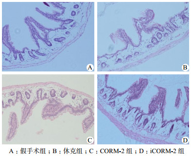 2 结果 2.1 各组大鼠肠道组织病理形态学观察如图 1所示,假手术组大鼠回肠黏膜固有层腺体细胞结构清晰,黏膜上皮完整,绒毛细胞排列整齐; 休克组大鼠回肠绒毛排列紊乱,绒毛表面明显游离,肠上皮细胞出现大量坏死,结构不连续,破坏明显; CORM-2组回肠上皮细胞少量坏死,绒毛部分节段结构不连续,未见明显水肿,较休克组显著改善; iCORM-2组肠黏膜上皮亦有大量坏死,绒毛水肿。与假手术组比较,其余各组Chiu评分升高,CORM-2组评分低于休克组和iCORM-2组,见表 1。