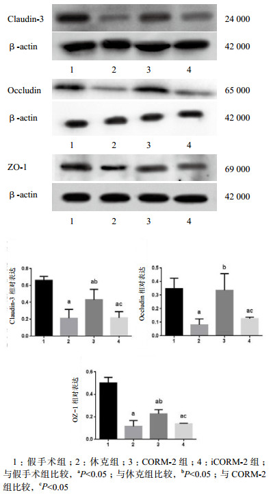 2.4 各组大鼠回肠组织ZO-1、Occludin、Claudin3蛋白表达水平比较由图 3可见,与假手术组比较,休克组、iCORM-2组Claudin3、Occludin、ZO-1蛋白表达均降低(均P < 0.05)。CORM-2组仅Claudin3、ZO-1表达水平低于假手术组(均P < 0.05),Occludin蛋白表达与假手术组差异无统计学意义(P>0.05)。且CORM-2组上述蛋白表达均高于休克组及iCORM-2组(均P < 0.05),后两组之间上述蛋白表达差异无统计学意义(均P>0.05)。