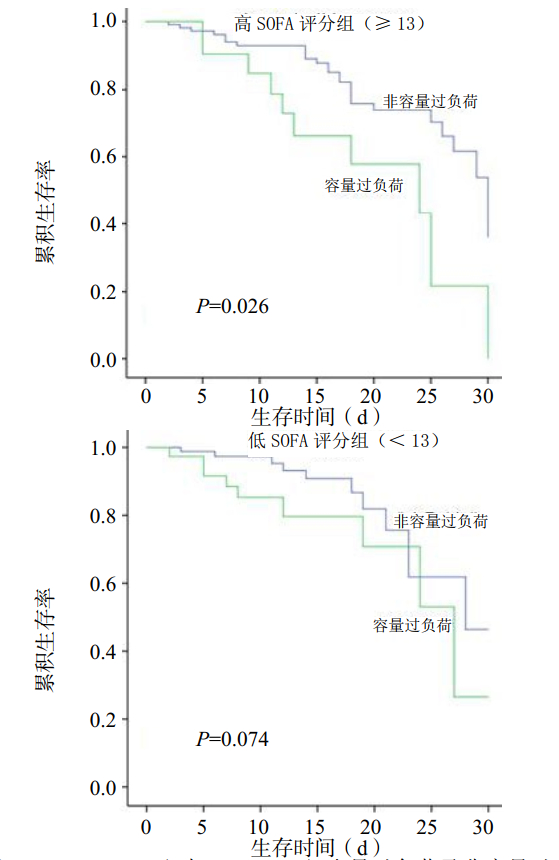 根据患者SOFA评分将患者分为SOFA≥13组(n=135)与SOFA < 13组(n=126)。SOFA≥13组容量过负荷(n=57)与非容量过负荷(n=78)患者的30 d生存率差异有统计学意义(P=0.026),SOFA < 13组容量过负荷(n=35)与非容量过负荷(n=91)患者的30 d生存率差异无统计学意义(P=0.074),见图 4。