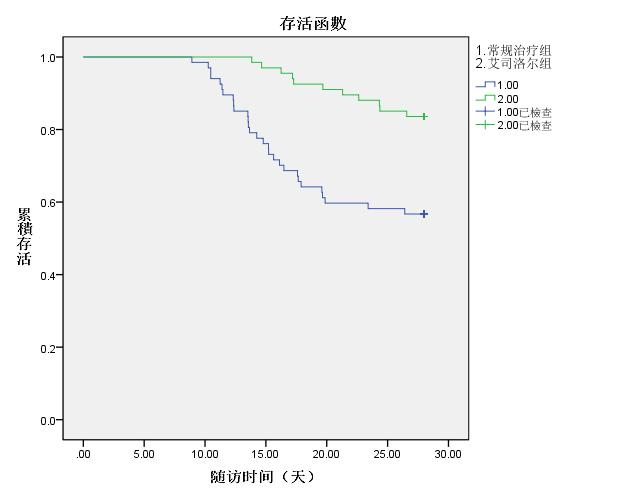 28 d随访结果显示,常规治疗组67例患者中,死亡19例,病死率为28.4%,艾司洛尔组67例患者中,死亡11例,病死率为16.4%,根据患者死亡人数,生存状态、生存时间绘制Kaplan-Meier生存曲线分析表明,两组患者28 d病死率比较,艾司洛尔组患者28 d生存率明显较常规治疗组升高(Log Rank检验13.481,P < 0.01),差异有统计学意义(P < 0.01)。见图 1。