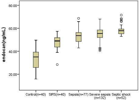 图 1 endocan的中位数水平在各组间的比较 Fig 1 Comparison of median levels of endocan among groups |
