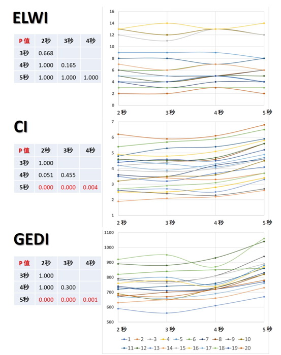 右图中分别以20种不同颜色的曲线代表 20位独立患者分别在不同推注速度测试下获得的ELWI、CI、GEDI的变化趋势;左图为对2、3、4、5 s四种不同速度推注获得的ELWI、CI、GEDI值进行两两比较,P < 0.05(红色)为差异有统计学意义 图 2 分别以2、3、4、5 s的速度推注温度指示剂对ELWI、CI、GEDI等PICCO检测值的影响 |