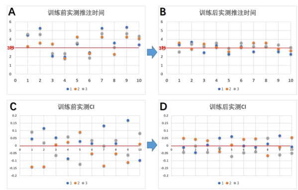 蓝红灰点分别代表同一操作者在同一时间对同一患者进行重复3次的温度指示剂的推注,以秒表记录实际推注的时间(A、B),同时提供个监测点的CI实测值(C、D);由于每位患者的基准CI存在个体差异,C、D图中各CI值实为矫正值(CI实测值/3次CI实测值的平均值);图A、C分别代表操作者尚未进行3 s推注速度训练时实际推注速度及CI值的分布;图B、D分别代表操作者进行3 s推注速度训练后实际推注速度及CI值的分布 图 3 以3 s作为目标速度对10位操作者进行规定速度推注训练前后推注速度(A、B)及CI实测值(C、D)稳定性的比较 |