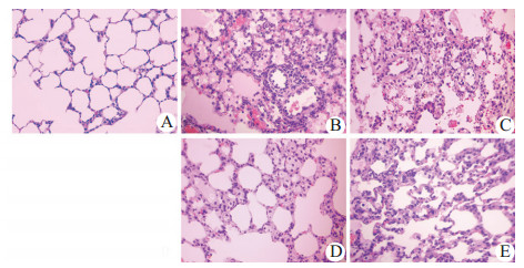 A:对照组;B:s组;C:s+HMP组;D:s+MMP组;E:s+LMP组 图 2 各组大鼠的肺组织病理(HE×100) Fig 2 Lung tissue histopathology of different groups(HE×100) |