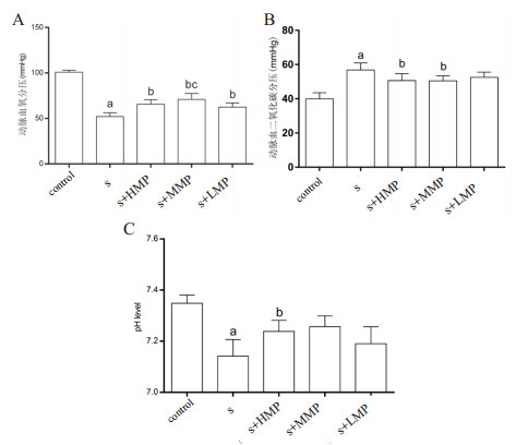 对动脉血中pH分析显示,s组pH显著低于对照组(P < 0.01),s+HMP组与s组相比显著升高(P=0.013);s+MMP组显著高于s组(P=0.005),与s+HMP组差异无统计学意义(P=0.31);s+LMP组与s组、s+HMP组和s+MMP组差异均无统计学意义(P=0.232,P=0.168,P=0.067),见图 4。