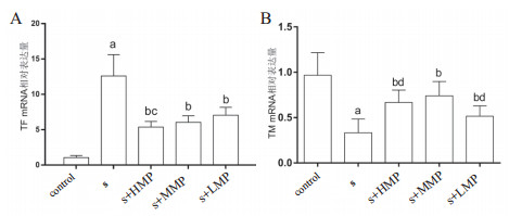 对各组肺组织中促凝因子TF和抗凝因子TM进行RT-PCR分析,结果显示,烟雾吸入后肺组织中TF的mRNA表达与对照组相比显著增高(P < 0.01);s+HMP组与s组相比显著降低(P < 0.01),s+MMP组与s组相比显著降低(P < 0.01),与s+HMP组相比差异无统计学意义(P=0.210);s+LMP组与s组相比显著降低(P=0.002),与s+HMP组相比差异有统计学意义(P=0.014),与s+MMP组相比差异无统计学意义(P=0.121)。烟雾吸入后肺组织中TM的mRNA表达与对照组相比显著降低(P < 0.01);s+HMP组与s组相比显著升高(P=0.003),s+MMP组与s组相比显著升高(P=0.001),与s+HMP组相比差异有统计学意义(P=0.029);s+LMP组与s组相比显著升高(P=0.040),与s+HMP组相比差异无统计学意义(P=0.06),与s+MMP组相比差异有统计学意义(P=0.018),见图 5。