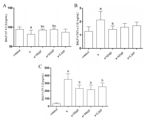 通过ELISA方法对BALF中的凝血因子F Ⅱ、TF、TAT-c进行检测。烟雾吸入后,BALF中的F Ⅱ显著降低(P=0.030),s+HMP组较s组显著回升(P=0.038),s+MMP组比s组显著升高(P=0.027),较s+HMP组差异无统计学意义(P=0.553),s+LMP组与s组差异无统计学意义,较s+HMP及s+MMP组显著降低(P=0.032, P=0.011)。对TAT-c的检测显示,烟雾吸入后s组TAT-c显著增高(P=0.016);s+HMP组较s组显著降低(P=0.031),MP治疗三组间差异均无统计学意义(P > 0.05)。对BALF中TF的检测显示,烟雾吸入后s组TF显著增高(P < 0.01),s+HMP、s+MMP、s+LMP组较s组均显著降低(P=0.007, P=0.006, P=0.026),MP治疗三组间差异无统计学意义(P > 0.05),见图 6。