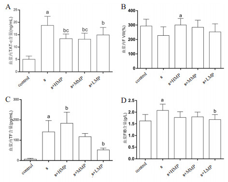 A:不同组血浆中TAT-c的含量;B:不同组血浆中F Ⅷ的活性;C:不同组血浆中TF的含量;D:不同组血浆中FIB的含量。Control:对照组;s:烟雾吸入组;s+HMP:烟雾+40 mg/kg甲泼尼龙组;s+MMP:烟雾+4 mg/kg甲泼尼龙组;s+LMP:烟雾+0.4 mg/kg甲泼尼龙组;与对照组比较,aP < 0.05;与烟雾组比较,bP < 0.05;与s+LMP相比较,cP < 0.05。F Ⅷ,凝血因子Ⅷ;TAT-c, 凝血酶抗凝血酶复合物; TF, 组织因子;FIB, 纤维蛋白原 图 7 甲泼尼龙对各组血浆中凝血因子的影响 Fig 7 Comparison of the coagulation factors in plasma among the 5 groups |