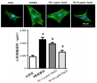 α-actin染色,×400,绿色荧光,细胞核为蓝色荧光;与对照组比较,aP < 0.05;与PE刺激组比较,bP < 0.05 图 2 Hsp22对原代大鼠心肌细胞肥大的影响 Fig 2 The effect of Hsp22 on cardiomyocytes hypertrophy |