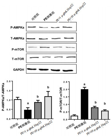 与PE刺激组比较,而1和10μg/mL的Hsp22均能增加AMPKα的磷酸化水平(0.87±0.11和1.18±0.27,t=5.89,P < 0.05;t=5.88,P < 0.05);其下游分子mTOR的磷酸化水平减少(0.78±0.09和0.56±0.08,t=16.80,P < 0.05;t=20.46,P < 0.05),见图 6。