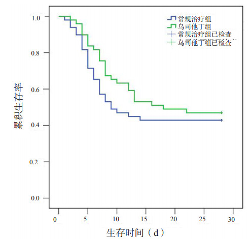 2.4 乌司他丁组与常规治疗组患者生存时间比较乌司他丁组和常规治疗组28 d存活率的差异无统计学意义(47% vs 43%,P=0.685)。Kaplan-Meier生存曲线显示,乌司他丁组患者的中位生存时间长于常规治疗组,但差异无统计学意义(18 d vs 9 d,P=0.363),见图 1。